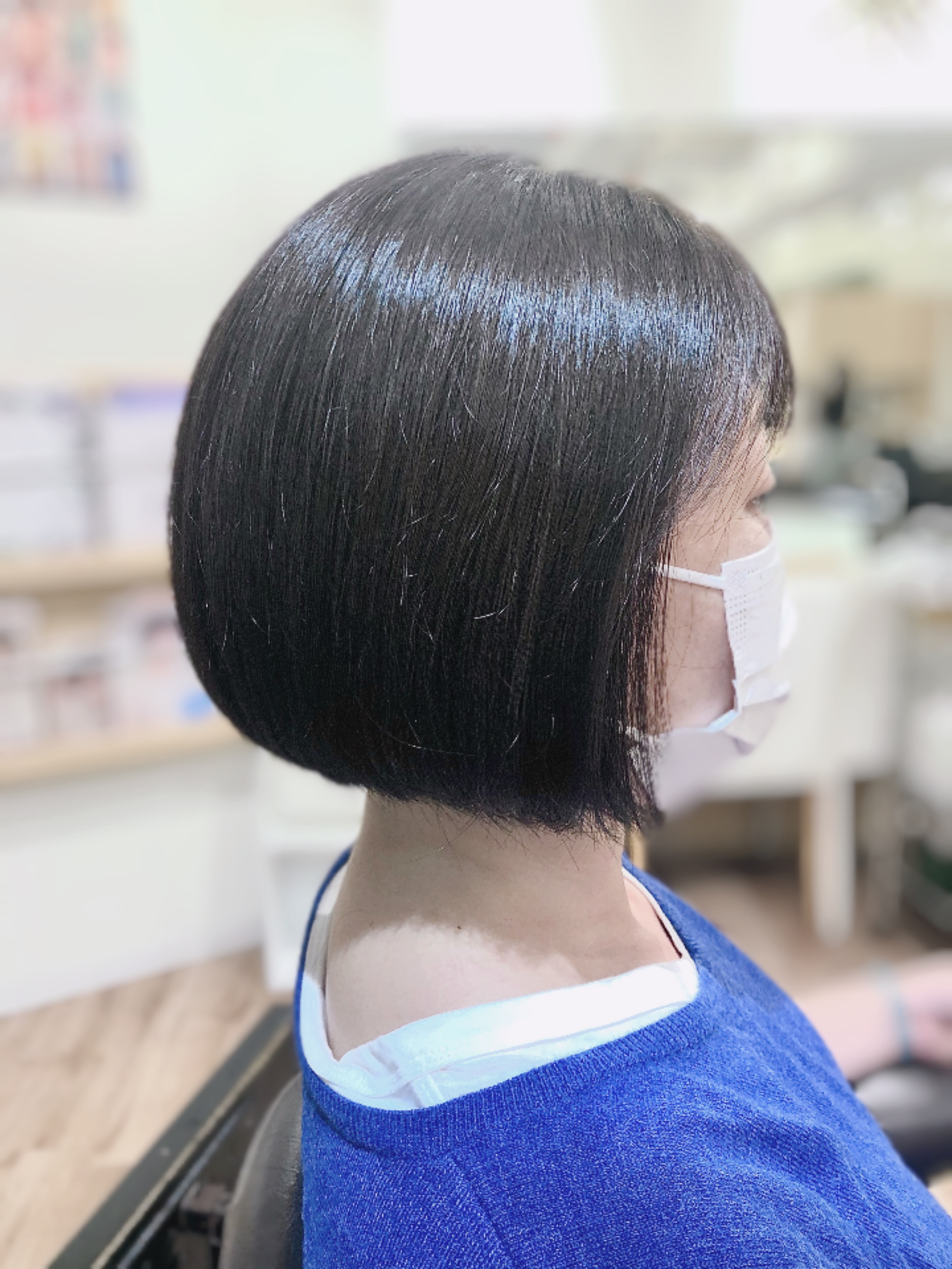 カットはえりギリギリのスッキリ前下がりボブ。